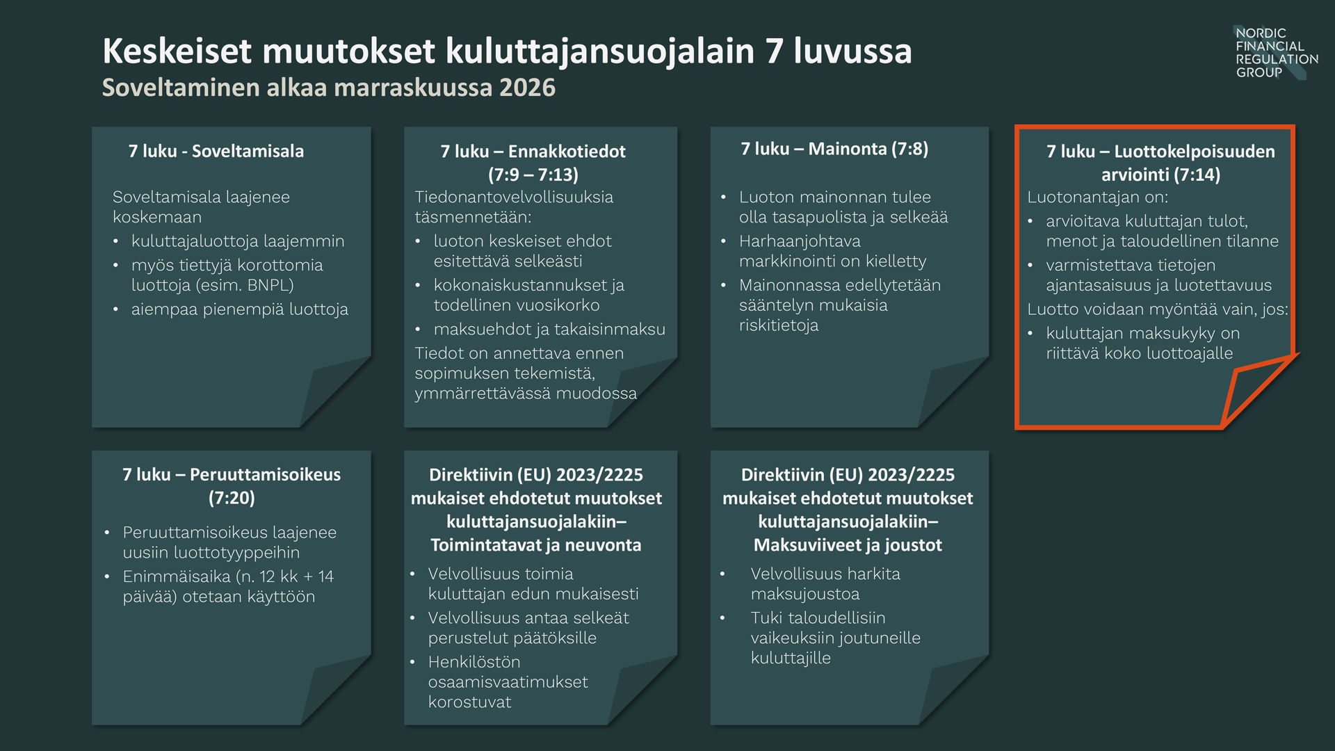 Arvioinnin yhteydessä tarkastellaan myös voimassa olevien luottojärjestelyjen ehtoja ja sopimusdokumentaatiota sekä tunnistetaan mahdolliset päivitystarpeet ennen 20.11.2026 voimaan tulevien lainsäädäntömuutosten johdosta (CCD2:n kansallinen täytäntöönpano). Samalla varmistetaan, että ohjausasiakirjat, toimintaperiaatteet ja sisäiset valvontajärjestelyt ovat keskenään johdonmukaisia ja tukevat sääntelyn mukaista toimintaa.